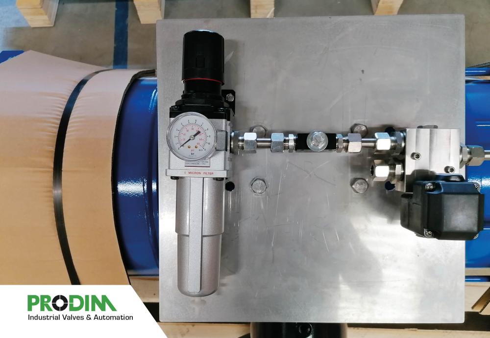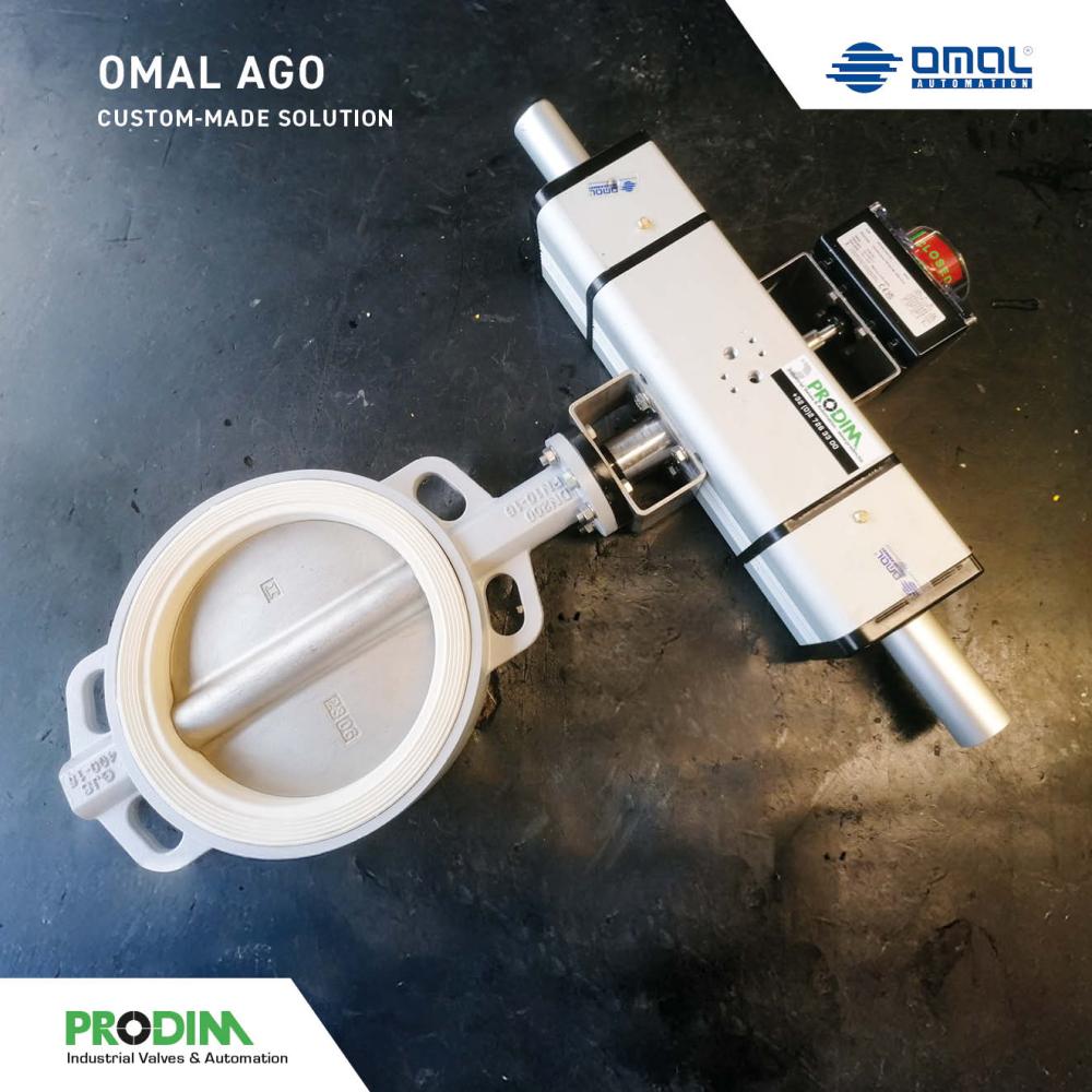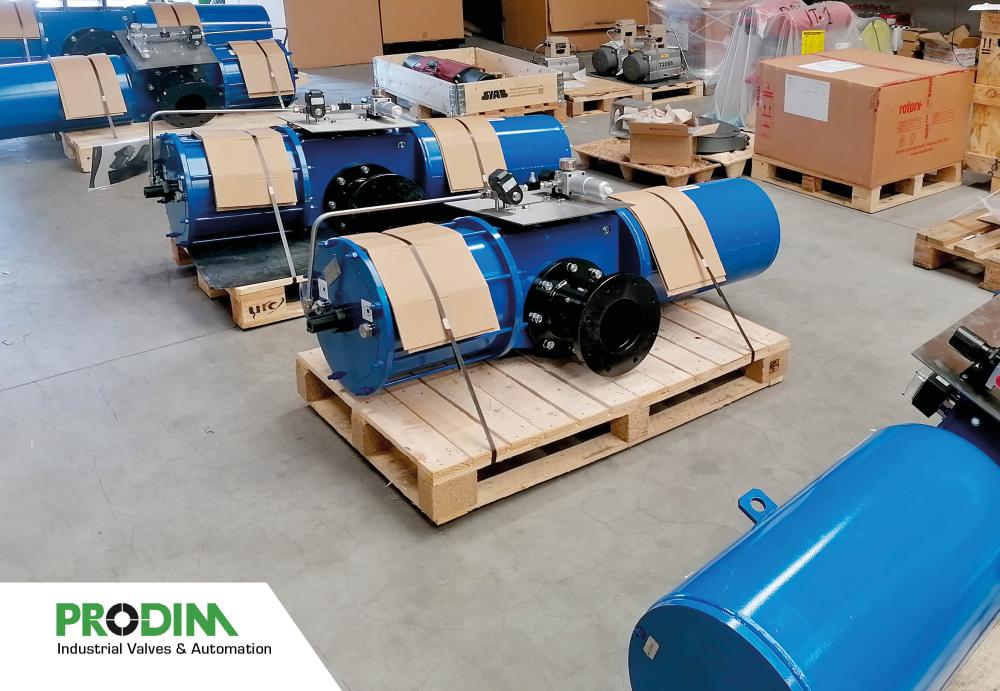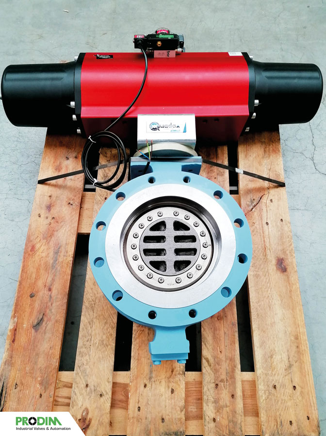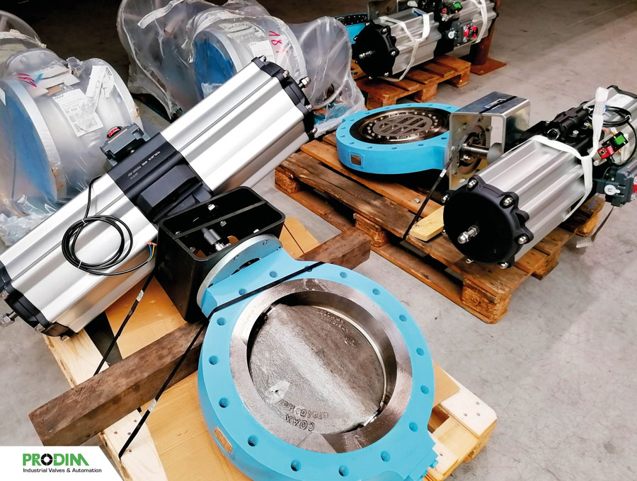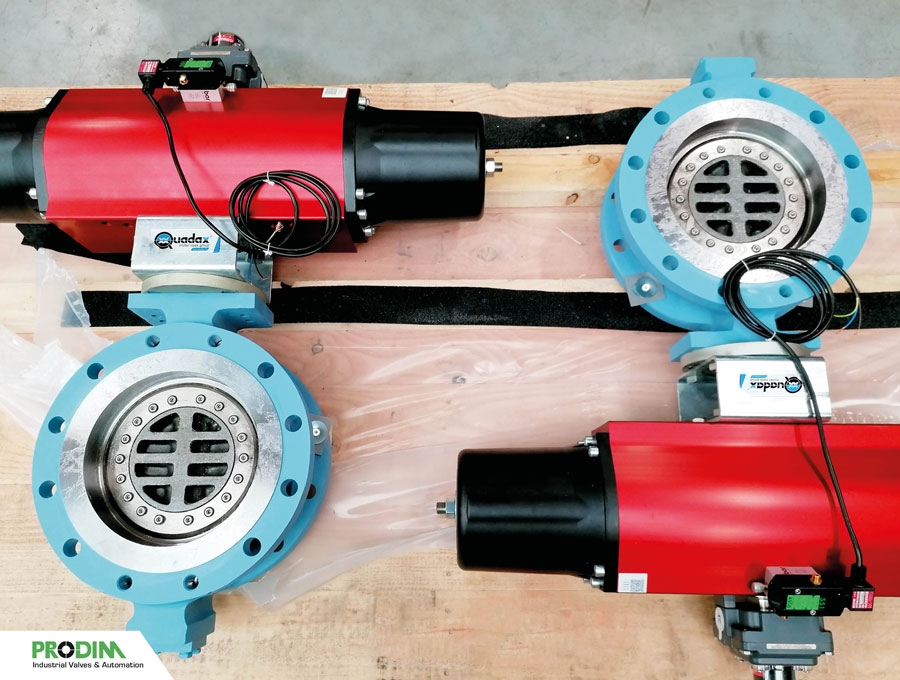 Quadax 4-offset butterfly valves with OMAL pneumatic actuators and accessories, assembled by PRODIM Industrial Valves & Automation.